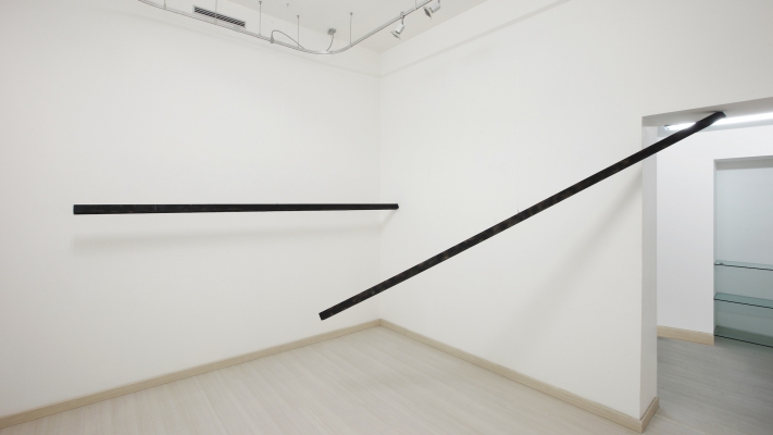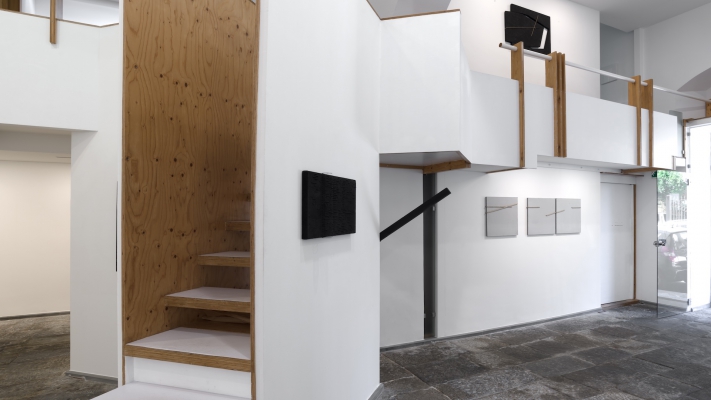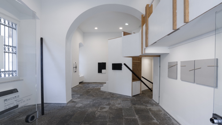 The installation site specific installation includes a series of Giovanni Campus's interventions in the space through the insertion of wooden planks that dialogue with the nuclei of works, in a cross-referenced relationship between one work and another, determining a temporal configuration of the representation in its becoming.
