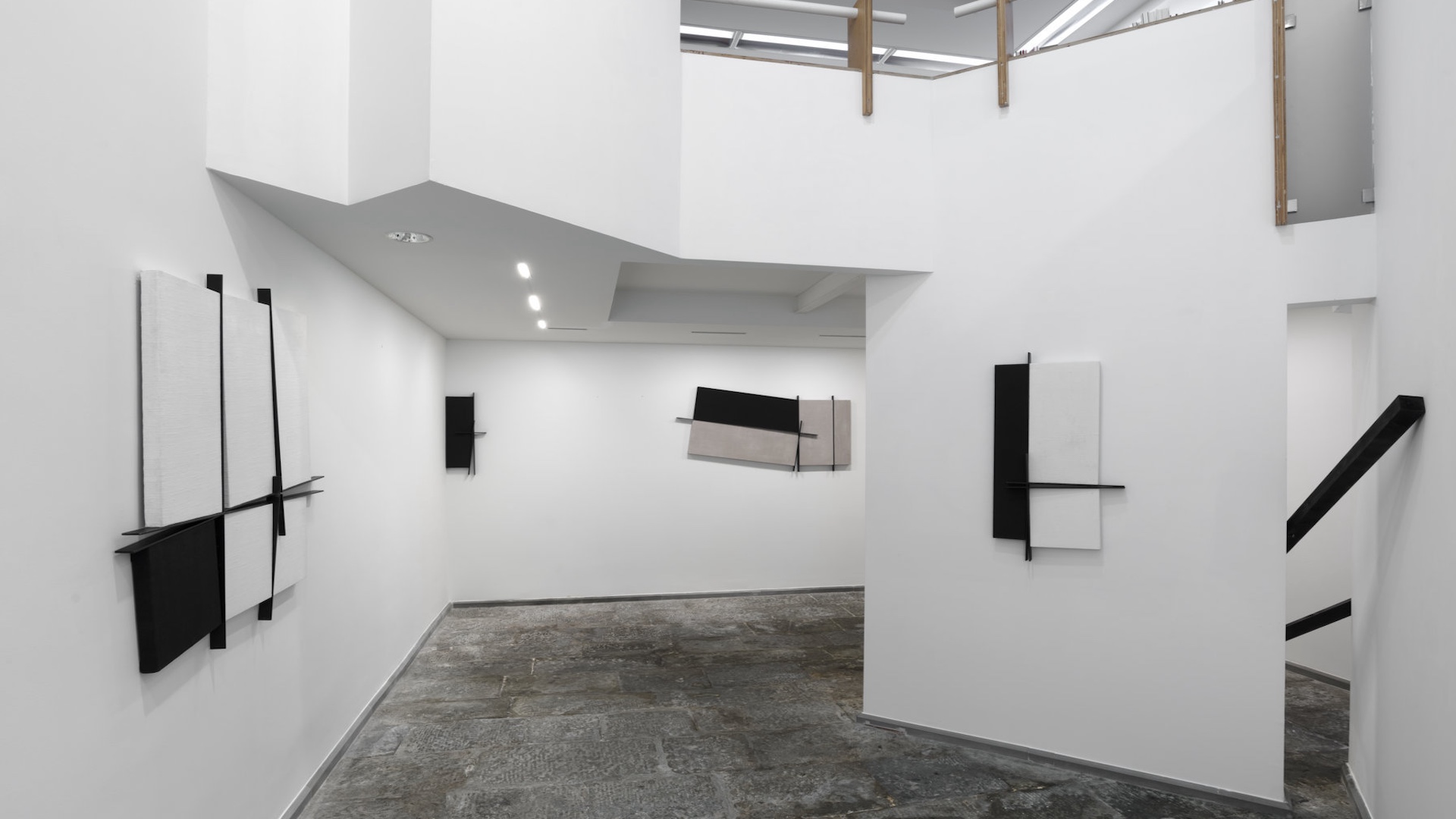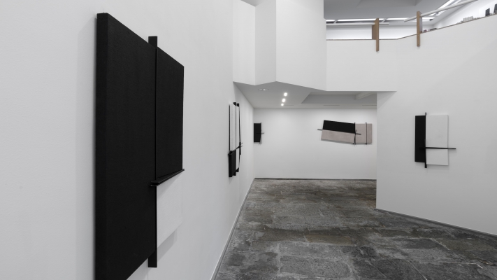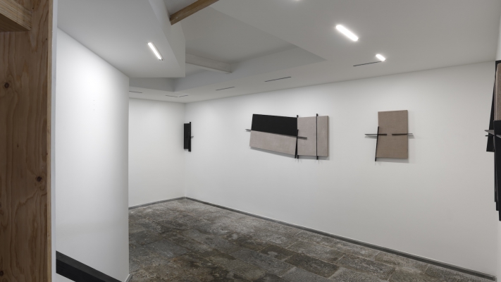 Menhir Arte Contemporanea presents a site-specific installation where suspended wooden planks and the grafting of iron and canvas fuse painting and sculpture, offering a new aesthetic proposition that transcends the spatial dimension to orient us within the work's time and becoming.
